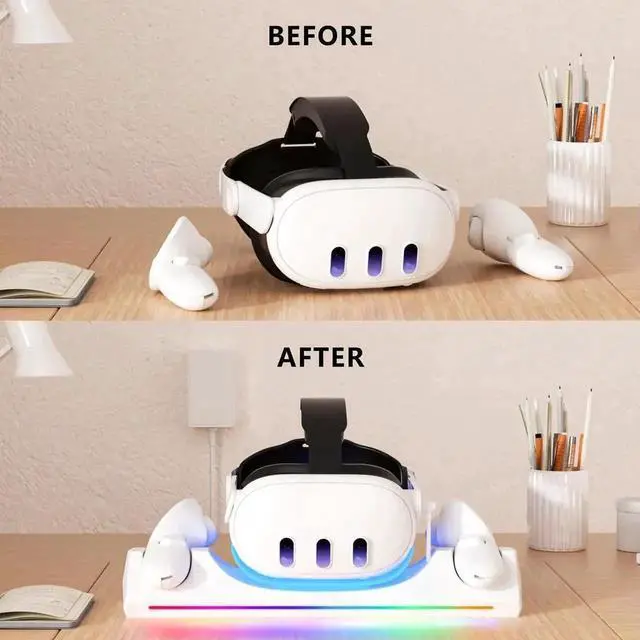 Strong Magnetic Attraction: The magnetic design can charge the Quest 3 headset and touch controllers simultaneously. Place your vr headset and controllers on the charging station to charge, makes placing me-ta quest 3 accessories more easier.