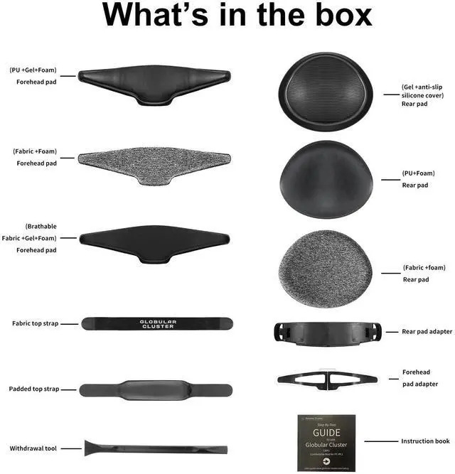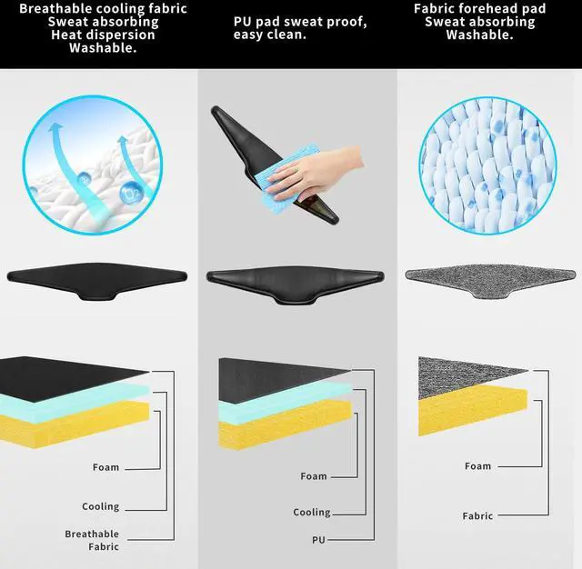 | Included Components | 1 padded PU top strap, 1 simple fabric top strap for super big / small size head user or those prefer non-padded top strap, 1 pcs PU rear pad, 1 pcs fabric rear pad, 1 pcs anti slip silicon rear cover , 1 pcs rear weight balancer, 1 pcs forehead pad adapter , 1 pcs rear pad adapter, 1 pcs soft washable fabric forehad pad,1 pcs soft breathable washable fabric forehead pad with cooling gel layer inside,1 pcs sweat proof PU forehad pad with cooling gel layer inside, 1 pcs tool to remove the stock pads, 1 user manual |