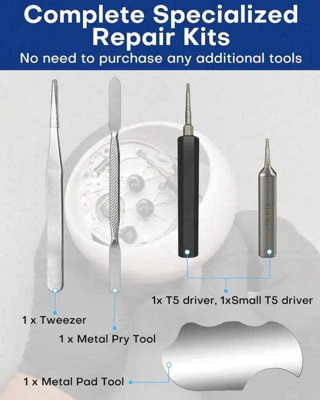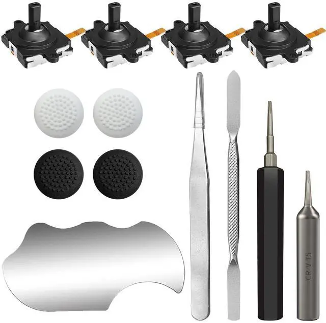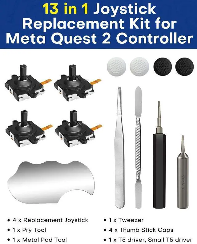 Comprehensive Package for ConvenienceThis repair kit includes 4 replacement joysticks, 4 thumbstick caps, 1 tweezer, 1 pry tool, and a T6 screwdrivereverything you need to fix your 0culus Quest 2 controllers at home.