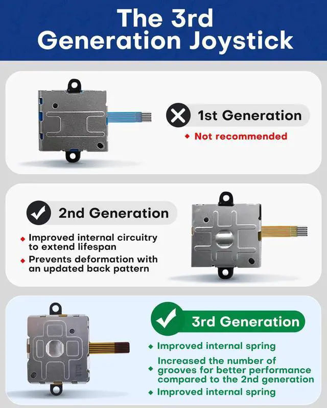Upgraded 3rd Generation JoystickThis new version features an enhanced internal spring, more grooves for extra durability, and an upgraded, highly conductive cable for better performance. It's also easier to install than previous models, reducing the need for frequent replacements and saving you costs.