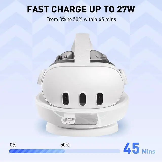 SuperFast Charge: Equipped with a standard fast-charging adapter, ensuring full-speed charging for Quest3 headset. Quest3 can be fully charged in about 1 hour and 50 minutes, and the Quest3 controller can be fully charged in 2.5 hours.