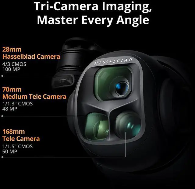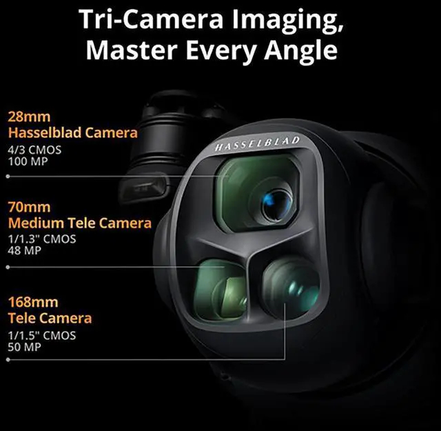 100MP Hasselblad main camera, large CMOS dual tele cameras, Infinity Gimbal with 360 Degree rotation, 0.1 -Lux Nightscape Omnidirectional Obstacle Sensing, DJI Mavic 4 Pro is a game-changer, boasting cutting-edge features that redefine our technology and take DJI drone imaging and flight performance to unprecedented levels. This triple-camera flagship drone is set to transform how you create and explore new horizons in aerial photography. Triple-Camera Imaging System - Master Every AngleIntroducing the advanced triple-camera system, where each lens excels, capturing exceptional images ranging from expansive wide-angle landscapes to detailed telephoto close-ups.