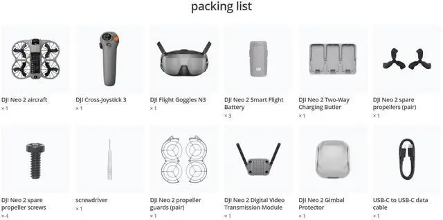 Includes DJI Neo 2, DJI RC Motion 3, DJI Goggles N3, DJI Neo 2 Digital Transceiver, three batteries, a charging hub, and propeller guards for easy FPV flying.
