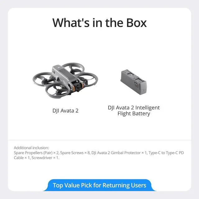 DJI Avata 2 (Drone Only) includes DJI Avata 2, 1 Intelligent Flight Battery, 2 pairs of additional propellers, and other items. A more cost-effective option. Needs to be used with Goggles and RC Motion 3 (sold separately).