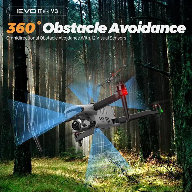 Autel Robotics EVO II Pro V3 Drone is equipped with front, rear, left, right, top, and bottom binocular vision sensing systems that use image data to calculate the distance between the aircraft and potential obstacles. This feature enables the drone to detect potential hazards at up to 30m away and accurately control its speed to avoid collisions. With this advanced obstacle avoidance technology, pilots can navigate through challenging environments and capture footage with confidence, knowing that the drone is capable of avoiding obstacles on its own.
