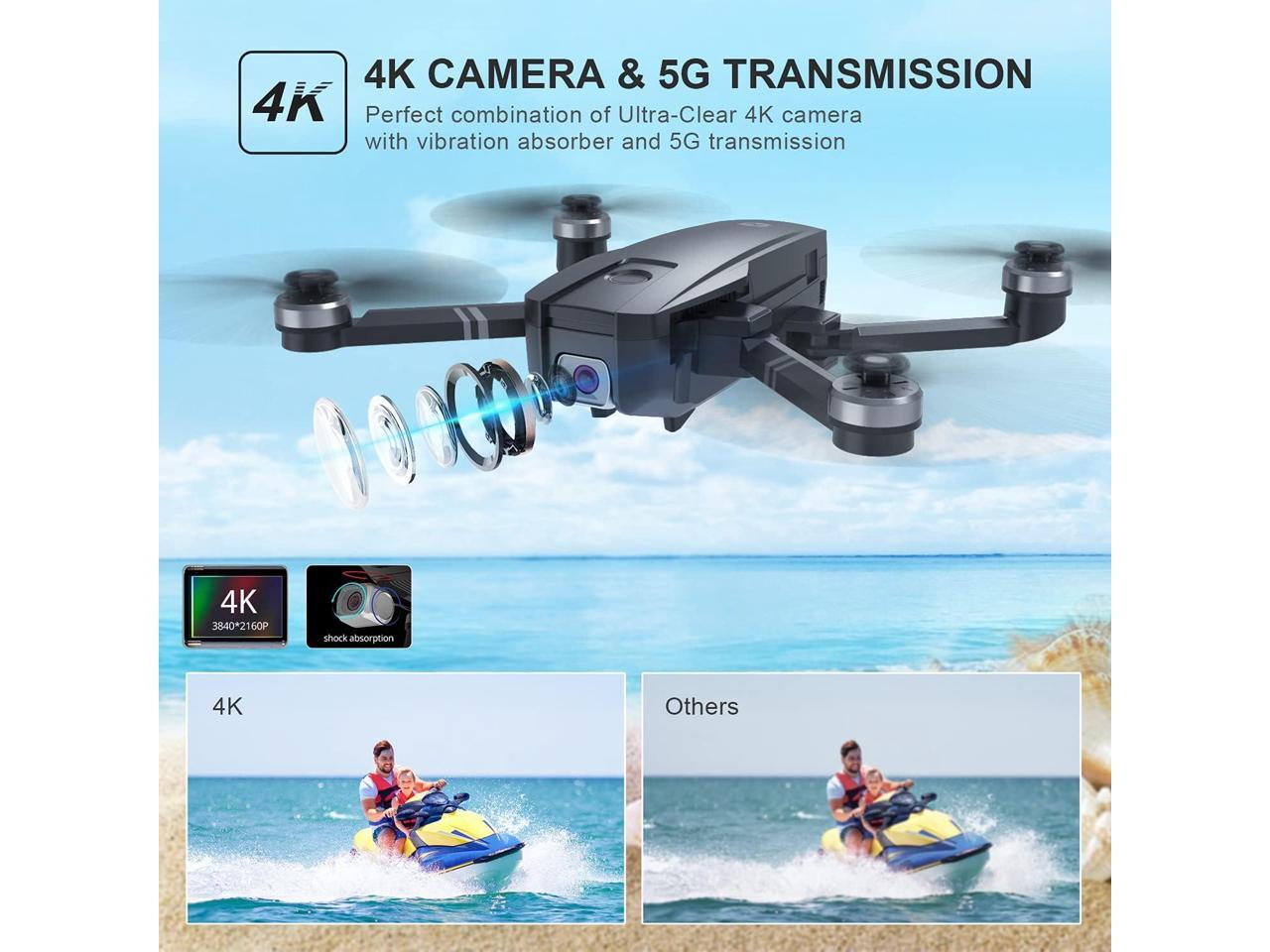 - 4K UHD Camera with Image Stabilization: The optimized full HD Camera built with Shock Absorption holder ensures shooting 3840 x 2160 high resolution images and videos without camera vibration. 5GHz FPV transmission and 90°adjustable lens enables you to see the word from different angle.