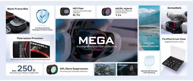 Each filter frame in this set is rigorously tested using Freewell's GimbalSafe Technology, ensuring no adverse effects on your drone's gimbal. The filters also feature a Dustproof, Scratch-resistant, Oilproof, and color-neutral coating, ensuring optimal image quality when shooting outdoors. The Mega 16-Pack includes an impressive array of 16 different filters, including ND16, ND32, ND64, ND128, ND256, ND512, ND1000, SMIST1/4, UV, LPR, CPL, ND16/PL, ND32/PL, ND64/PL, ND128/PL, and ND256/PL filters. This extensive selection gives you the power to create cinematic video footage like never before.