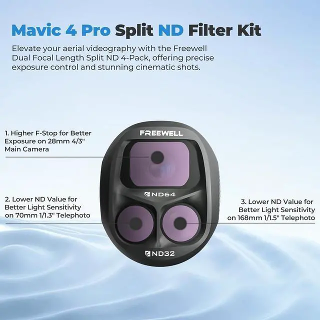 Extreme Light ControlThe Split ND64/ND32 filter reduces light by 5-6 stops, perfect for bright conditions and smooth long exposure effects without overexposure. Bright Condition MasteryIdeal for bright daylight or harsh lighting, this filter keeps exposure in check for professional-quality shots. Gimbal-Safe FitFreewell's Gimbal Safe technology ensures a stable, secure attachment, preserving your Mavic 4 Pro's gimbal while delivering smooth footage. Crystal Clear OpticsCrafted from premium optical glass, this filter ensures sharp, distortion-free images with accurate color reproduction.