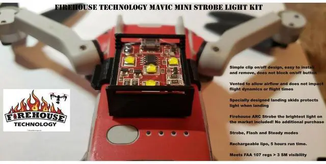 Before you embark on your next aerial adventure, consider the Bottom Strobe Light Kit for DJI Mavic Mini, a must-have accessory for drone enthusiasts. This kit features a Firehouse Technology Arc Strobe light, complemented by our newly updated custom mount. Crafted from flexible "Gray" PetG, this mount seamlessly blends with your aircraft's aesthetics. The design of this bottom strobe light kit is simple yet effective, attaching effortlessly to the underside of your DJI Mavic Mini. Notably, it does not obstruct the on/off button, eliminating the need for unnecessary removals and potential damage to the part.