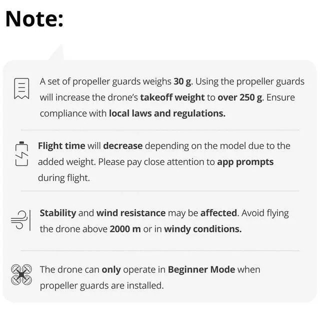 Using the propeller guards will increase the drone's takeoff weight to over 250 g. Ensure compliance with local laws and regulations. When propeller guards are mounted, the drone operates in Beginner Mode only.