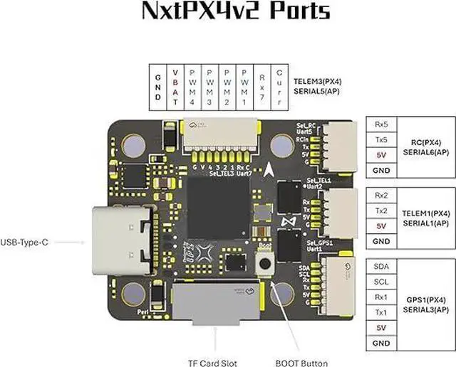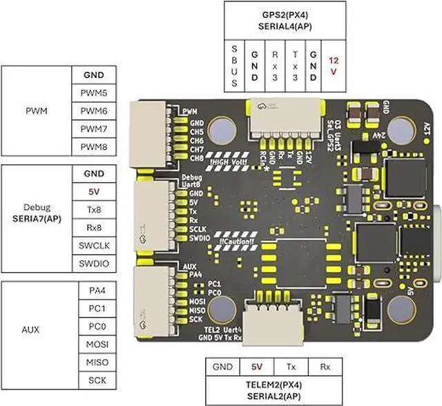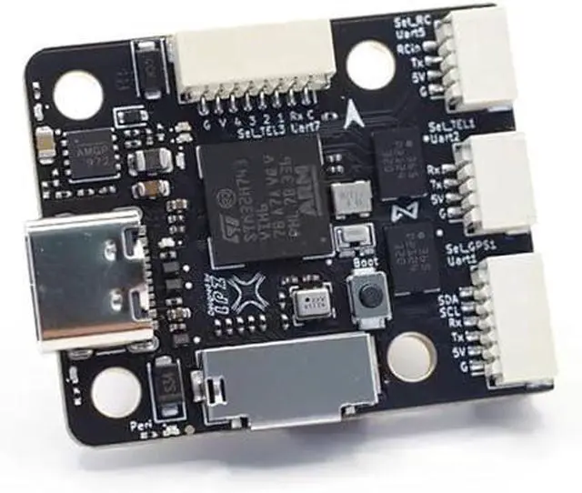 Extensive Expansion & Compatibility Supports Ardupilot and PX4 firmware with 7x UART, 8x PWM, I2C, and SPI interfaces, enabling easy integration with GPS, optical flow, O3 transmission, Raspberry Pi onboard computers, LiDAR, 3D cameras, and other research peripherals.