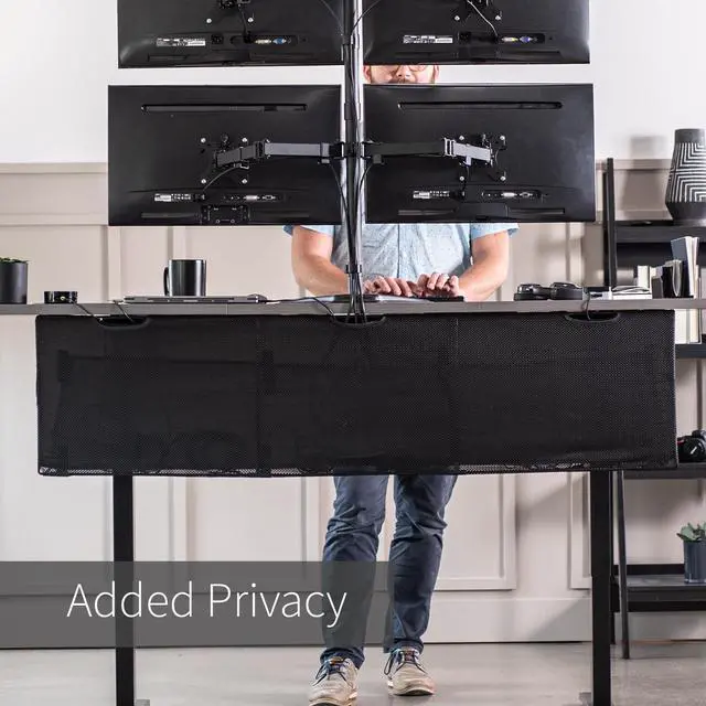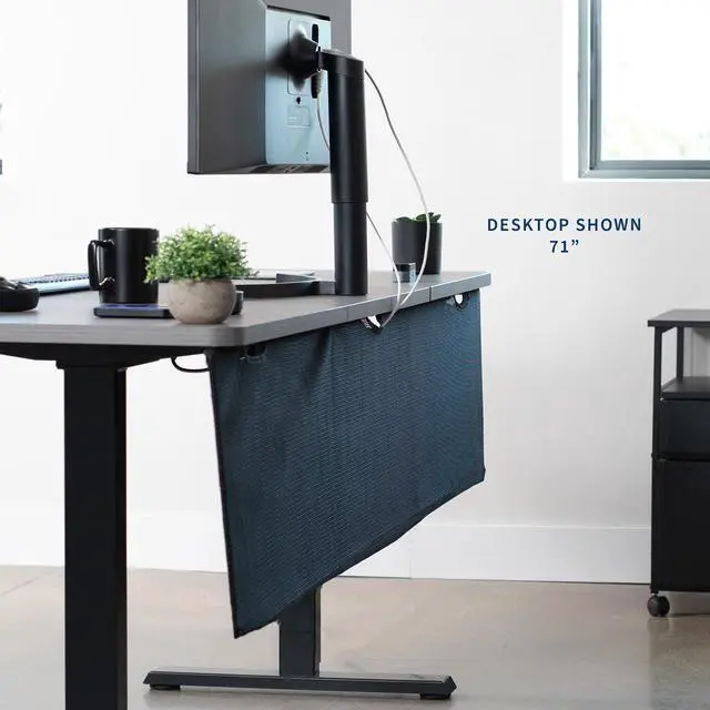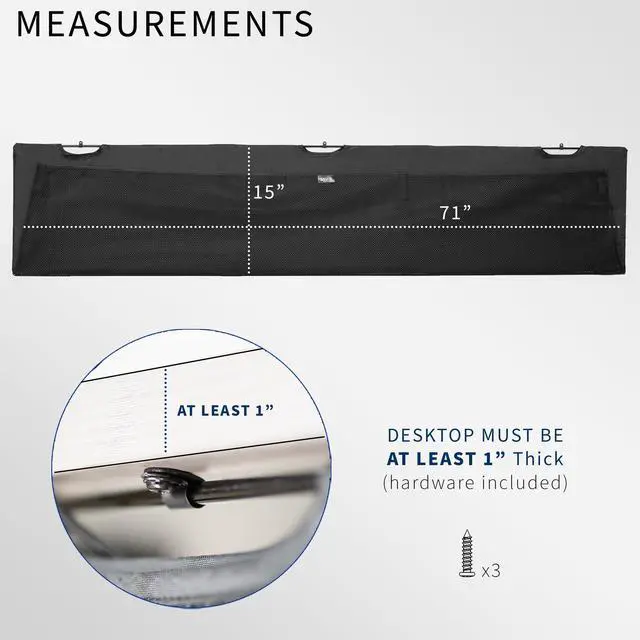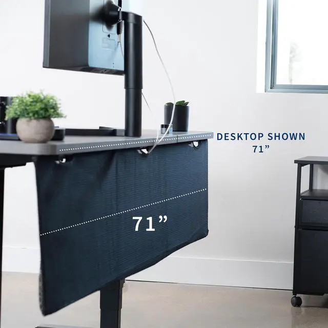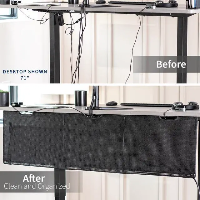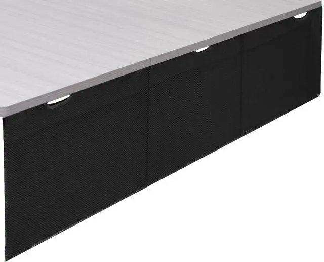 Increase the comfort of your work area by adding a level of privacy with this classic desk skirt (DESK-SKIRT-71) from VIVO! Made of a sleek, black fabric that's lightweight and functional, this under-desk cover will complement the majority of office environments. Offering user-geared features like cable management slots for an organized appearance and mesh pockets for extra storage space, this product was designed for a convenient workstation setup. All hardware is provided to get your desk skirt ready to go in no time!