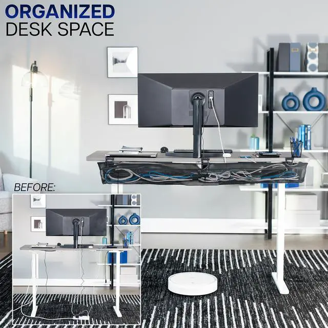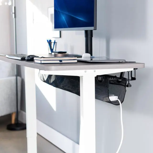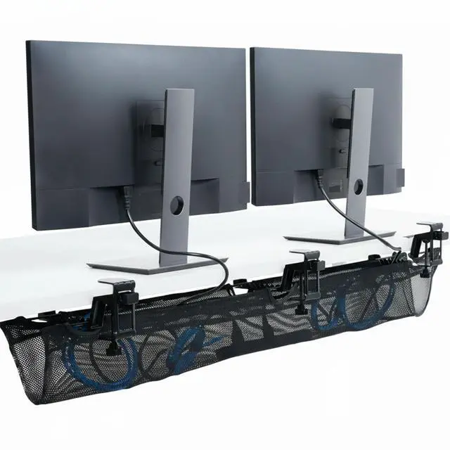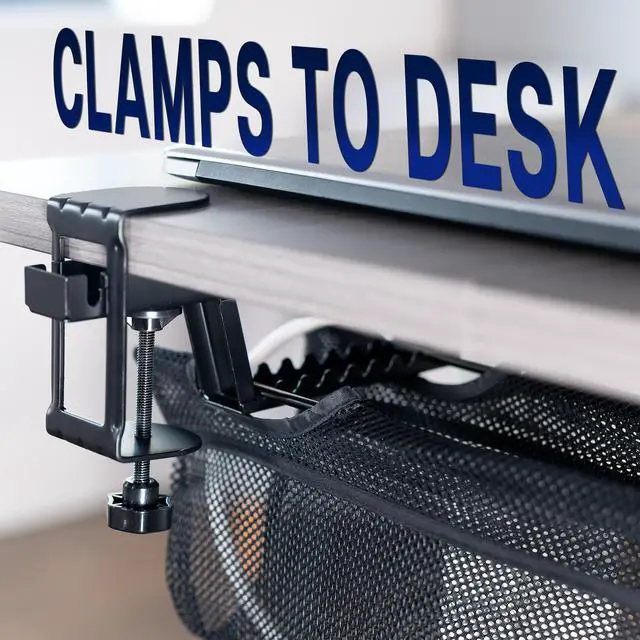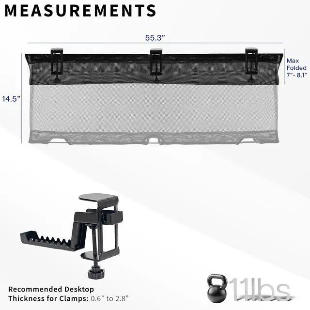 Conveniently route your workstation cables with the 55" Clamp-on Under Desk Mesh Cable Management (DESK-AC55MH) from VIVO! The clamp-on design secures to your desk with simple hand tightening. Black mesh material loops over the clamps to create a sleek under-desk cable net to securely hold cords, USB hubs, and more. This 55 cable holder provides optimal airflow for your power strips and power bricks while helping to neatly route them for an organized appearance. The depth can be adjusted depending on where the loops are placed on the clamp, hanging just 7 to 8.1 below the desk surface. Clear the clutter and add organization to your workstation with this convenient under-desk cable management solution!