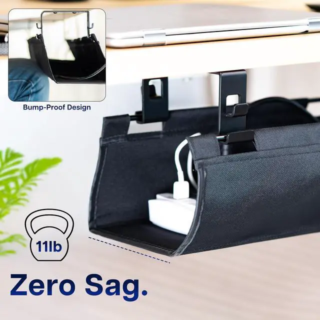 Help to efficiently manage and store your cords and devices with this VIVO 31-inch screw-on fabric cable management tray (DESK-AC31F-S). This product offers a simple, low-profile solution for concealing and routing power strips, AV cords, power bricks, and various cables under your desktop. Featuring a durable black Oxford fabric material, capable of supporting up to 11 lbs, this wire organizer easily screws onto desk edges with a minimum thickness of 0.75. The brackets offer an adjustable clearance space of 6or 7 ensuring a clutter free workspace underneath. This clamp-free setup provides your cords with built-in straps and includes cable clips to give additional security, while the fabric tray's sides can be easily unhooked from the brackets for quick access when needed.
