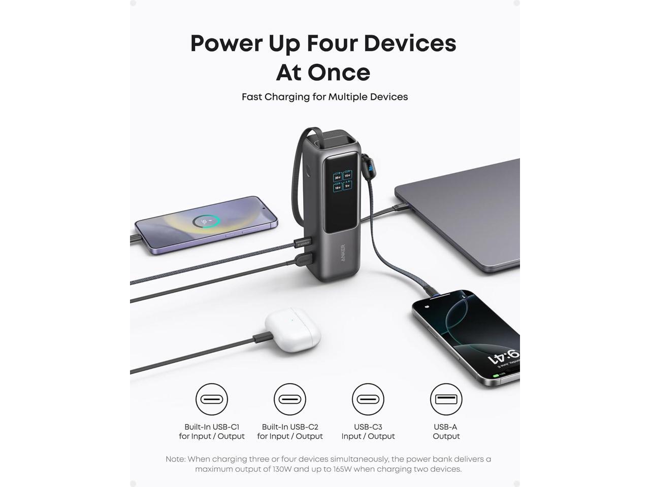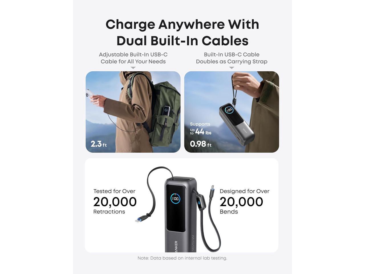 Anker Laptop Power Bank, 25,000mAh Portable Charger with Triple 100W USB-C Ports for Multi-Device Charging, Built-in and Retractable Cables, for iPhone 16/15 Series, MacBook, Samsung, and More