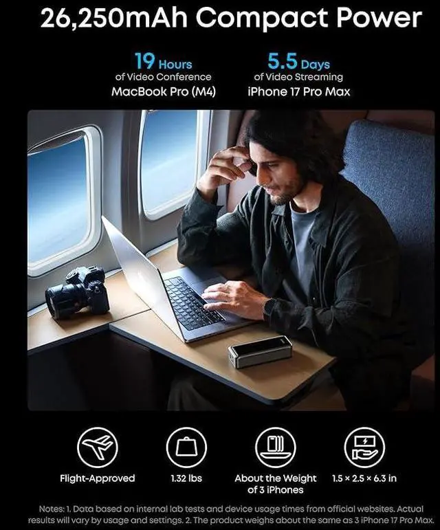 Huge Power That's Ready to Fly: Delivers 26,250mAh (99.75Wh) of TSA-approved capacity to charge a MacBook Pro (M4) up to 0.8 times.
