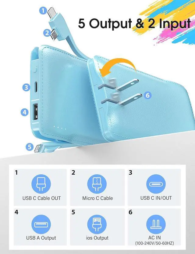 Cables: This all-in-one power bank embedded with AC wall plug and charging cords connects the battery pack to the phone and outlet together. It is allow able to recharge itself directly from the wall socket and power your phone with the built-in cord No additional cables are requiredBattery Pack with