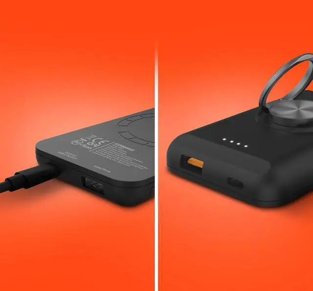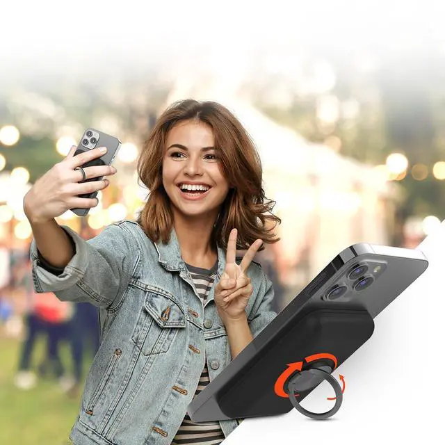 Use the dual outputs: 20W USB-C Power Delivery and 18W Fast Charge USB for additional devices. Its ultra-slim, lightweight design ensures a seamless fit that wont block your camera or add unnecessary bulk. Plus, the built-in 360° ring holder kickstand adds a secure grip and doubles as a stand for hands-free streaming, scrolling, or creating content on the go. Snap it on, power up, and stay connected!