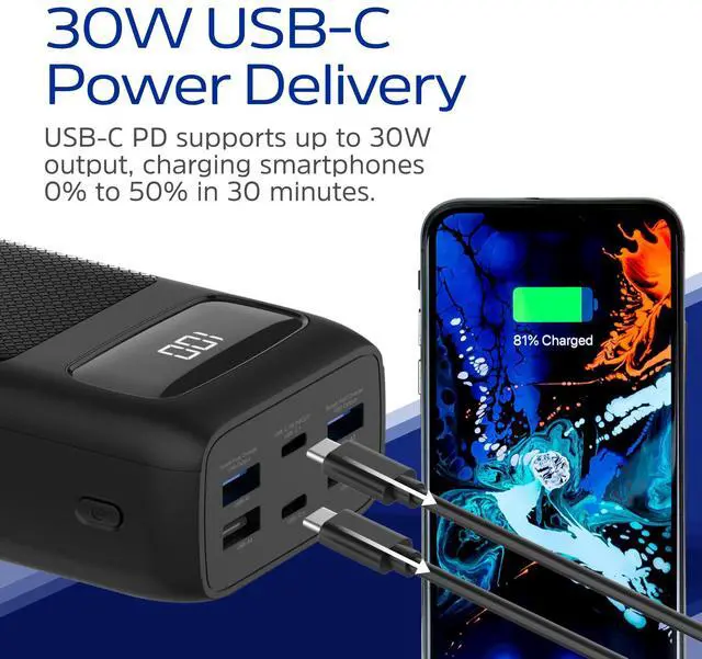 Equipped with four USB-A and two USB-C output ports, this power bank allows you to charge up to six devices simultaneously.