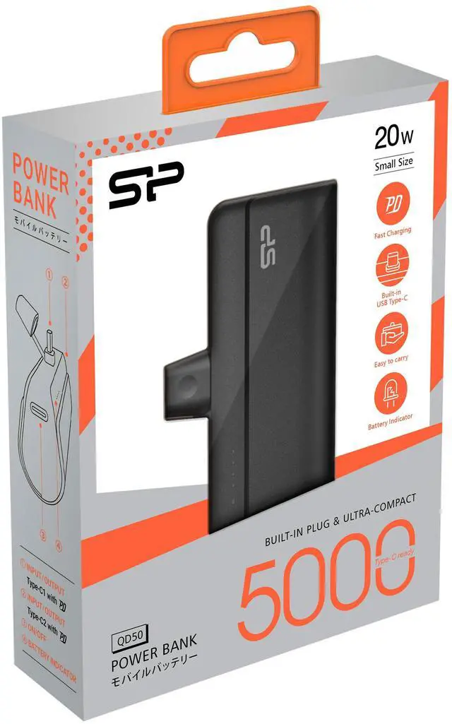 Silicon Power QD50, 5000mAh Compact USB-C Power Bank, Black Model SP5K0MAPBKQD500K