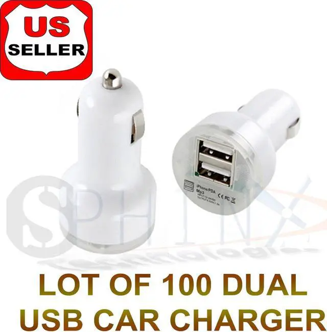 Quantity: 100 DUAL USB CAR CHARGER FIT in any car and works with any USB charging based cell phone, Simply any device that can charge from a computer USB Port can charge from this car charger. 1 port's output is for 2A, 5v devices for charging large screen device, "otherwise, large devices may not charge if you plug in the 1A marked port"the other port output is marked 1A, 5v current for charging small devices. small devices can still be plugged ot the 2A port for faster charge"