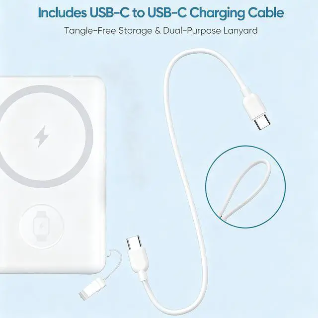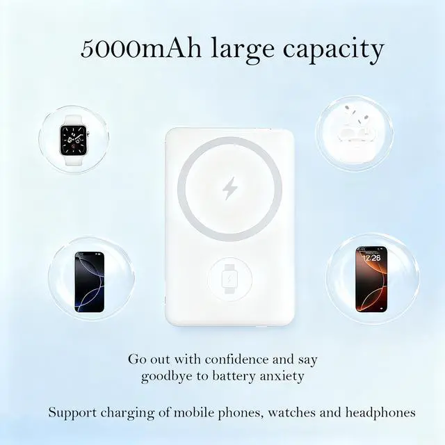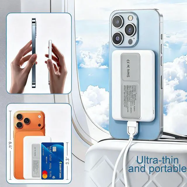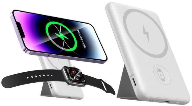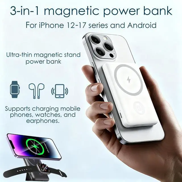 Lightweight magnetic bracket power bank, suitable for MagSafe function, suitable for charging all series of iPhone12-17 iWatch and Airpod Pro; Comes with a built-in cable that is super convenient
