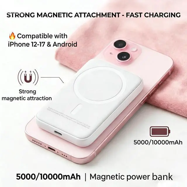 Experience reliable power on the go with this slim and high-capacity magnetic power bank, designed specifically for cell phone users seeking efficient charging solutions. Featuring advanced magnetic charging technology, this power bank securely attaches to compatible devices for a seamless and convenient charging experience. The integrated fast charging capability ensures your devices are powered up quickly, minimizing downtime. Its compact and lightweight design makes it easy to carry in a pocket or bag, while the generous capacity provides multiple charges for your smartphone or other mobile devices. Ideal for travel, work, or daily use, this power bank is a practical accessory for maintaining connectivity wherever you are.