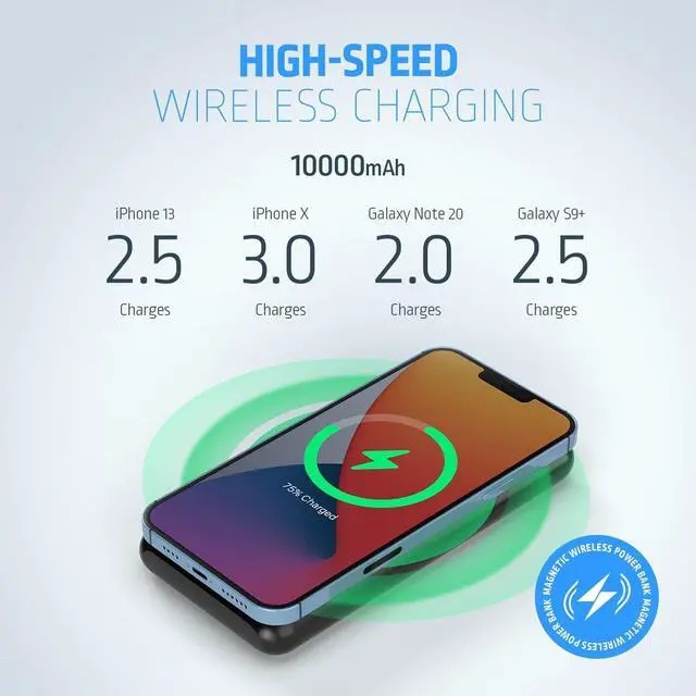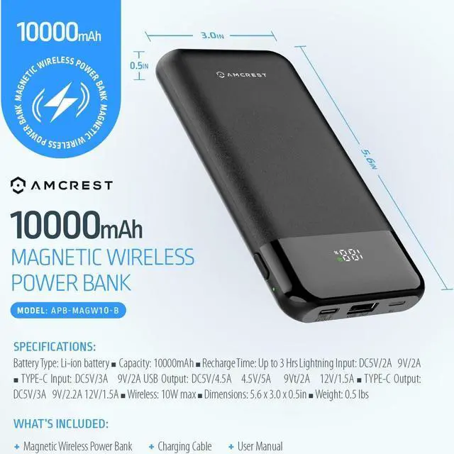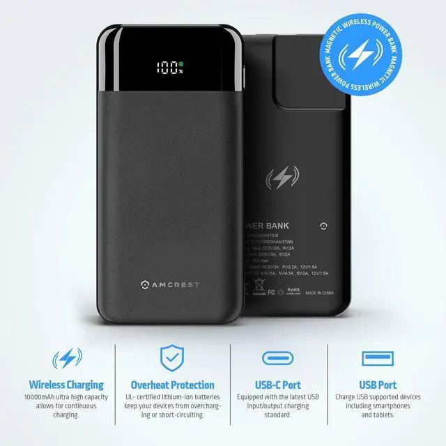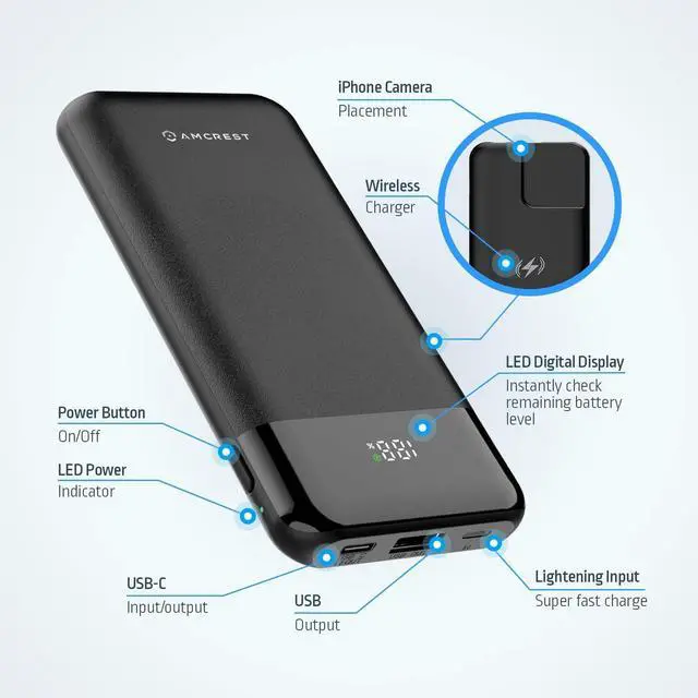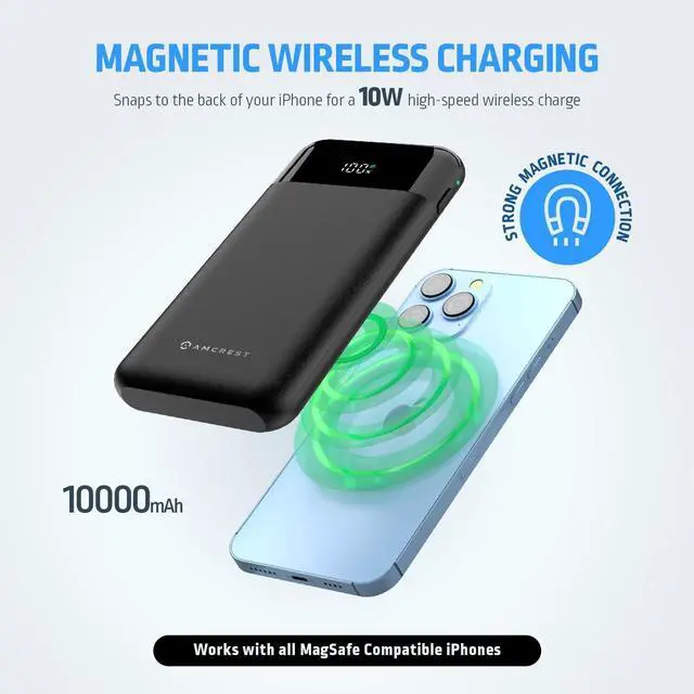 This device provides a convenient magsafe wireless charging as well as a Type-C USB input/output, a Lightning Port Input, a fast charge port and a digital display