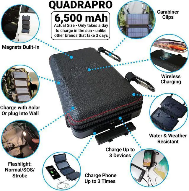 ULTRA-POWERFUL PANELS: Create the power you need from the sun quickly with our solar phone charger power bank. Four high-powered 5.5W solar panels fold open to charge the on-board, ultra-high capacity, 6, 500 mAh battery capacity (this is actual capacity, unlike other brands that overstate their capacity).