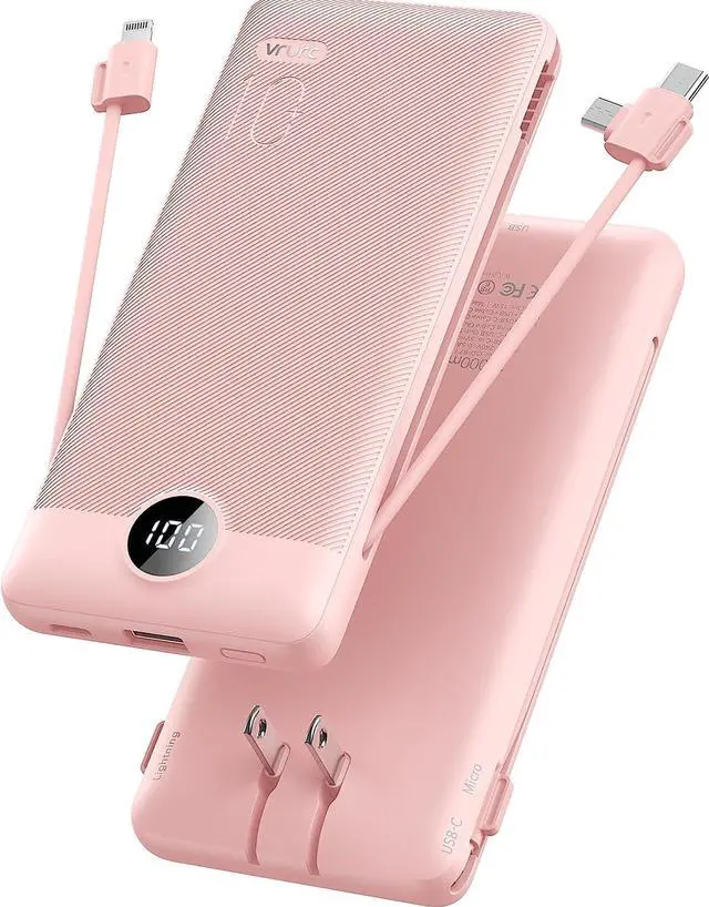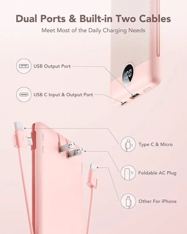 Portable Charger With Built-in Charging Cables and PortsThis USB C portable charger not only has a built-in micro cable, type C cable, and other data cables, but also is equipped with a USB input port, Type-C input, and output ports. Using the built-in cables to charge, the portable battery charger is compatible with iPhone, Android devices, and USB-C most mobile phones and smart devices. This external battery power bank can meet most of the charging needs of daily life.