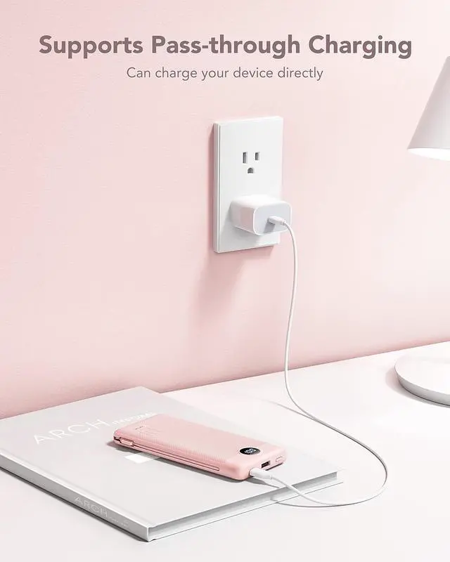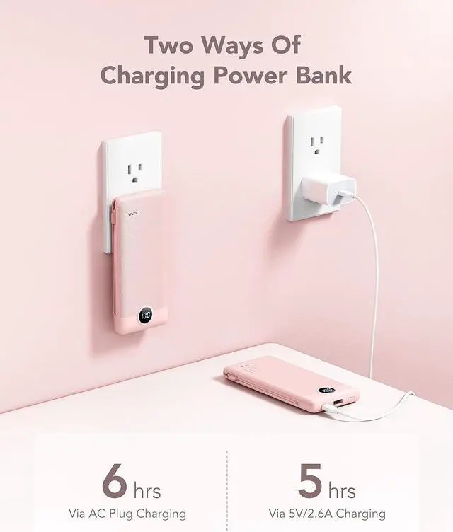 Portable Charger With Built-in AC Wall PlugPortable phone charger with built-in AC Wall Plug can charge the power bank itself directly from the wall outlet. You don't worry about forgetting to carry your cable and adapter, It's ready for you all the time.