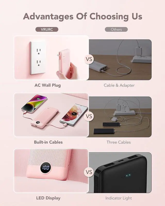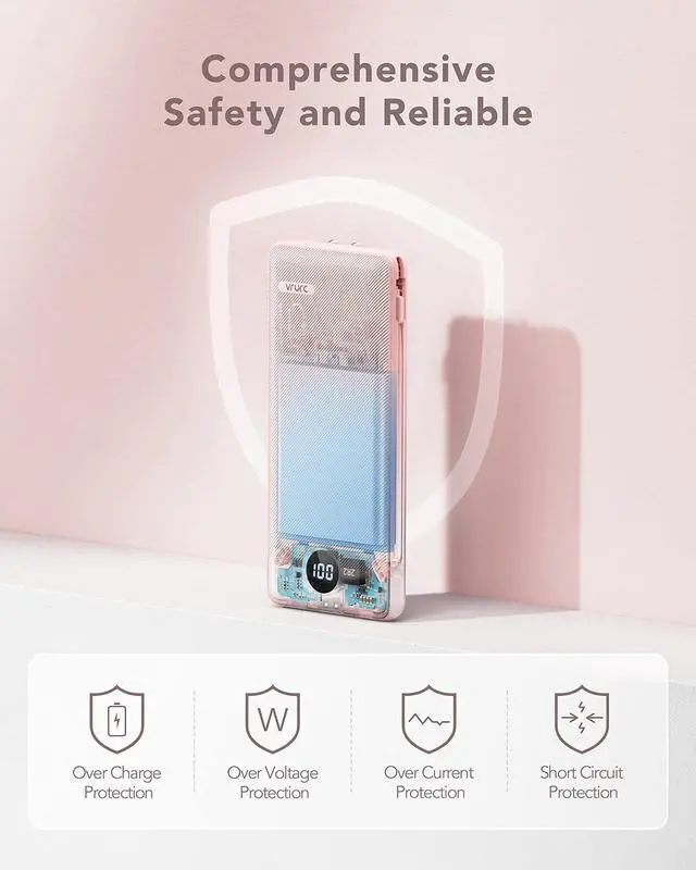 Safety ChargingThe 10000mah power bank built in wall plug uses high-quality smart chip, which will protect your device from overcharge, overcurrent, overvoltage, and short-circuit, creating a safe charging experience for you. *