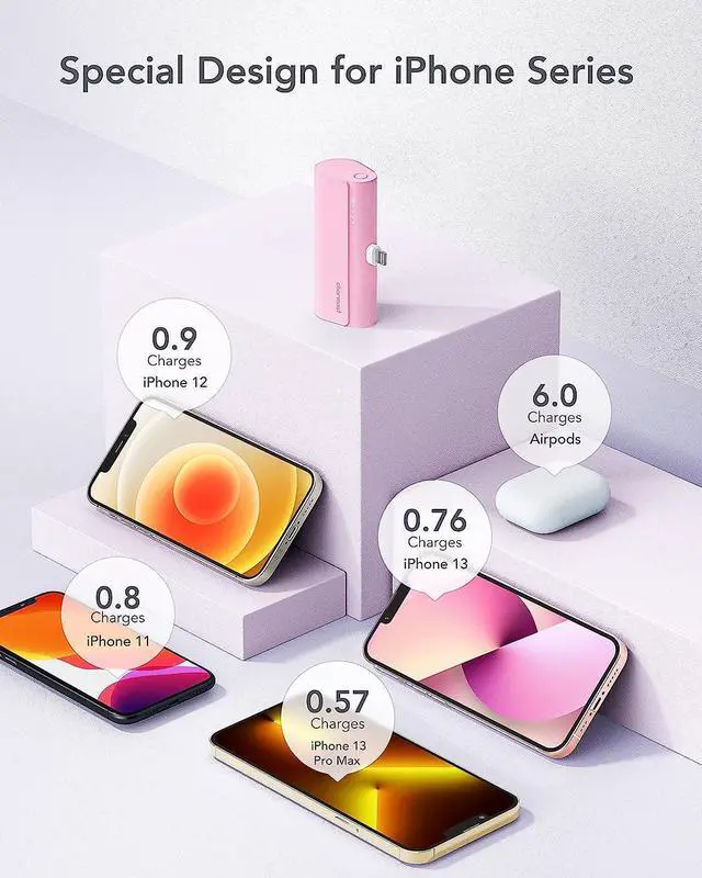 5000mAh Capacity: 5, 000mAh battery capacity provides 0.65 charges for iPhone 13 Pro Max, 0.79 charges for iPhone 13, 0.9 charges for iPhone 12, 0.8 Charges for iPhone 11, 0.9 charges for iPhone XR, 6 charges for AirPods (2nd Generation).
