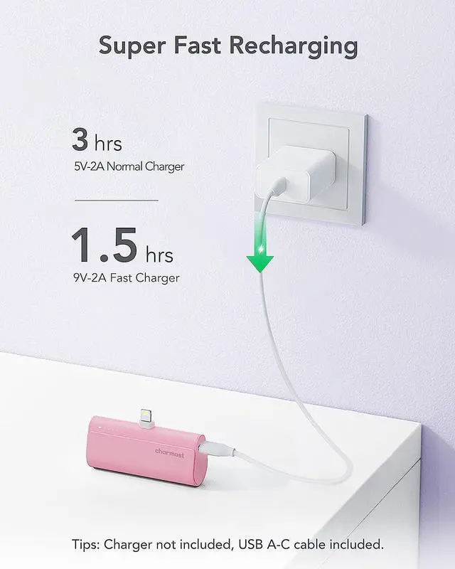 18W PD Fast Recharging: Fully charge this portable charger for only 1.5 hours with a 9V-2A charger. It will take 3 hours if you use a 5V-2A charger. (USB C adapter not included, the USB C port on the side is for input only. )