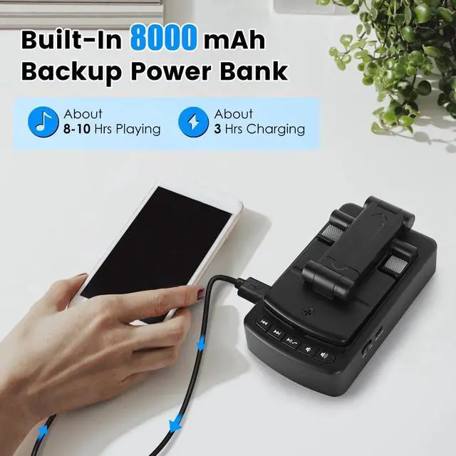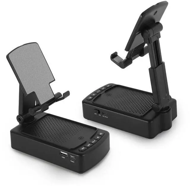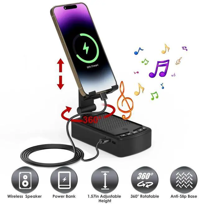 - 3-In-1 Phone Stand With Speaker:Integrated 3 diverse functions into 1 compact device,this multifunctional cell phone stand also serves as backup power bank and wireless speaker. Built-in 5W driver delivers enhanced bass,accurate mid-range frequencies and clear high sound,providing immersive sound experience. Simply press the buttons to effortlessly adjust the volume,answer/reject calls,or switch between songs.