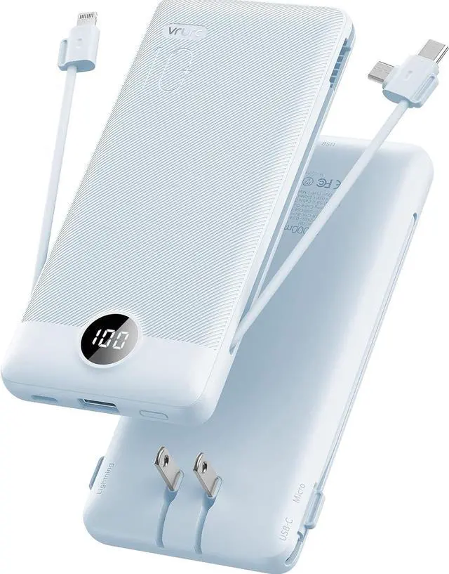 VRURC Portable Charger Built-in Cables and AC Wall Plug, USB C Power Bank 10000mAh, [2023 Upgraded Version] Phone Charger Compact Lightweight External Battery Pack for Smart Phones, Tablets etc