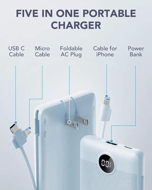 [Portable Charger With Built-in Cables & AC Wall Plug] Not only it has a built-in Micro cable, USB C cable, and other charging cable for iPhone, but also is equipped with a USB port, and USB C port. Also, Portable phone charger is built-in wall plug that charges the power bank itself directly from the wall outlet.