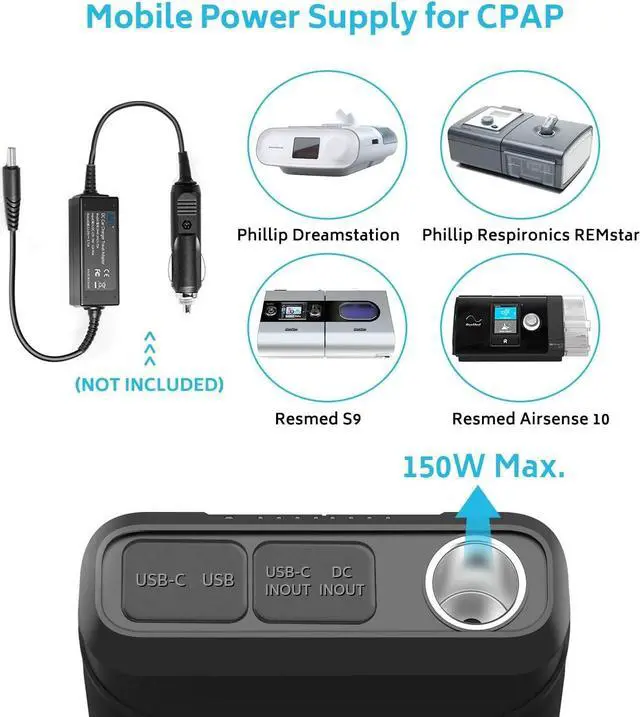 Off-Grid Power for CPAPThe high-performing DC 12V/5A (150W max. ) cigarette lighter port is ready to boost most CPAP machines on the market with a CPAP adapter (PURCHASED SEPARATELY), including Philips Dreamstation, Resmed Airsense/Aircurve 10, and Resmed S9. Please turn OFF the heater & the humidifier for extended runtime.