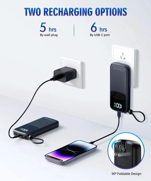 Portable charger with built in cableIt is no longer necessary to take extra charging cables when going out. Portable charger built-in AC Wall plug allows you to recharge itself directly from the wall outlet without carrying adapter or any extra cables.