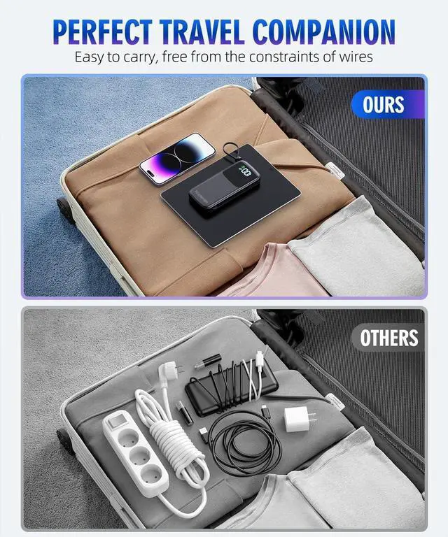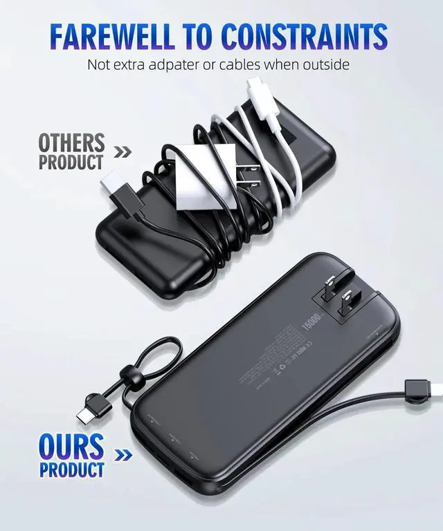 Wide Compatibility: Portable charger is designed with 4 outputs: Type-C cable, iPhone cable, USB-A and Type-C output ports. USB-A port works with most electronic devices, Type-C Port compatible with iPhone 15 but type-c cable cannot.