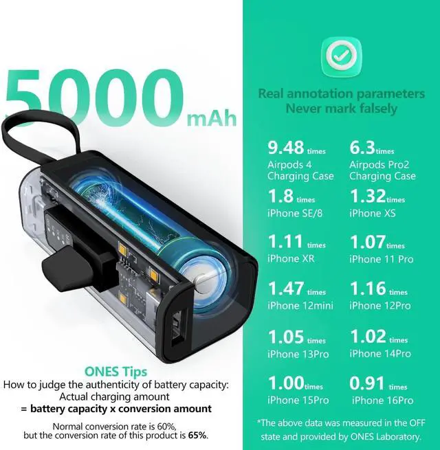 Small Emergecy Battery Backup ChargerONES Power bank is true 5000mAh ( 3.7V Battery), fully charge your phone at least once. No longer worry about low battery, an ideal charging companion for short travel and outdoor activities.
