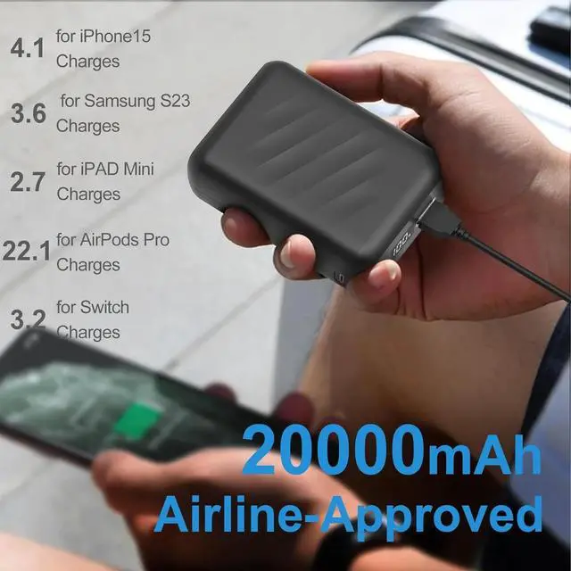 Small Size, Light WeightCompact and lightweight at 10.9 oz/310g, with rounded corners for comfortable carrying. Compatible with most smartphone, pad, Bluetooth headset, smartwatche, camera, and more, this cell phone portable charger can charge an iPhone 15 4.1 times, Samsung S23 3.6 times, or iPAD Mini 2.7 times. This mini power bank is perfect for on the go and as an airplane travel essential.