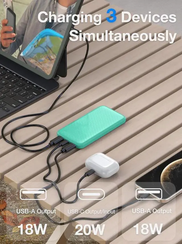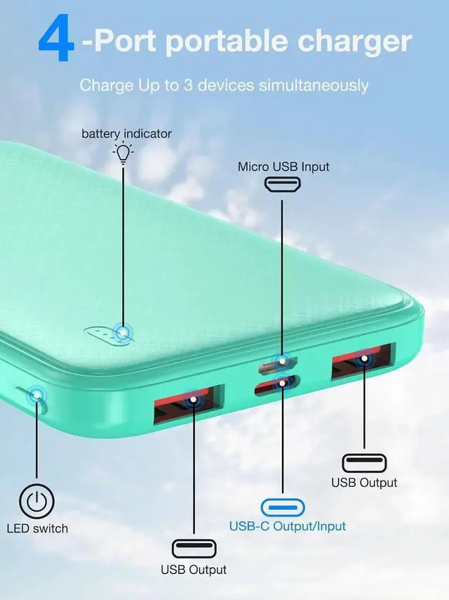USB-C Input & Output: The USB-C power bank is equipped with a USB-C port, which can input and output to perfectly fit your new iPhones, iPads, and all upcoming USB-C devices. There are also 2 USB-A ports, so you can charge up to 3 devices at once. You can share the battery pack phone charger with your friends.