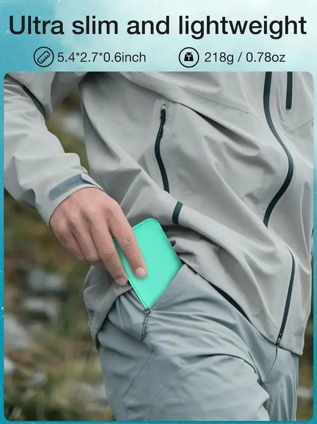 [Super Slim]At only 0.6 inches thick and weighing only 219 g, this portable battery pack fits in any backpack, purse, or work bag. Lightweight and compact, making it essential for business, travel, hiking, and camping.