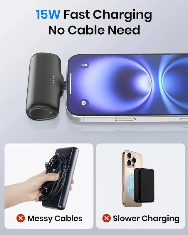 15W Fast Charging TechnologyEquipped with 15W fast charging, this compact charger can boost your phone' s battery from 15% to 65% in just 30 minutes, delivering charging speeds three times faster than regular chargers. If you' re tired of carrying extra cables and want a hassle-free charging experience, this plug-and-play portable charger is the perfect solution.