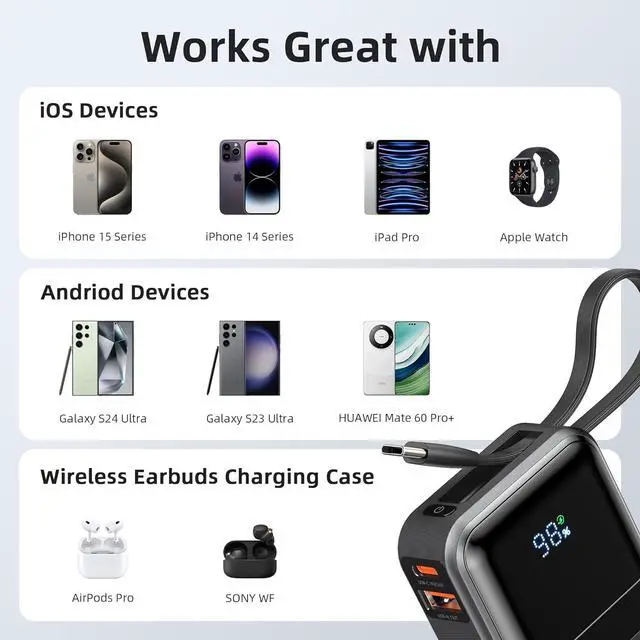 Rapid Portable Charger Type C: This 10, 000mAh power bank features 2 built-in cables (iOS & Type-C) and 2 charging ports (USB-A & USB-C), compatible with iPhone 16/15/15 Pro, Samsung-Galaxy-S23/S22/S21, Google Pixel, iPads, and more. Charge 4 devices at once time. Airline-approved, its the perfect travel companion