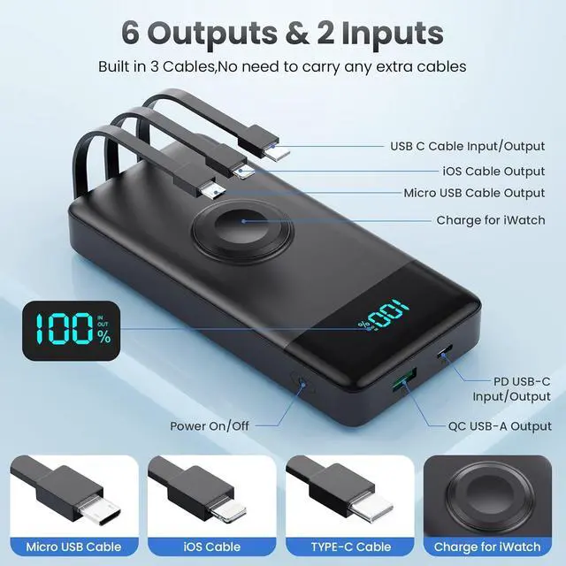 6 Outputs and 2 Inputs Portable chargerPortable charger has 6 outputs and 2 inputs, you may charge 6 devices simultaneously, recharge battery pack with 2 options easily. Portable charger builts in 3 cables, 1 wireless charging for iWatch and 2 ports. Great for multi electronics users who has iPhone, android, micro devices or Apple Watch.