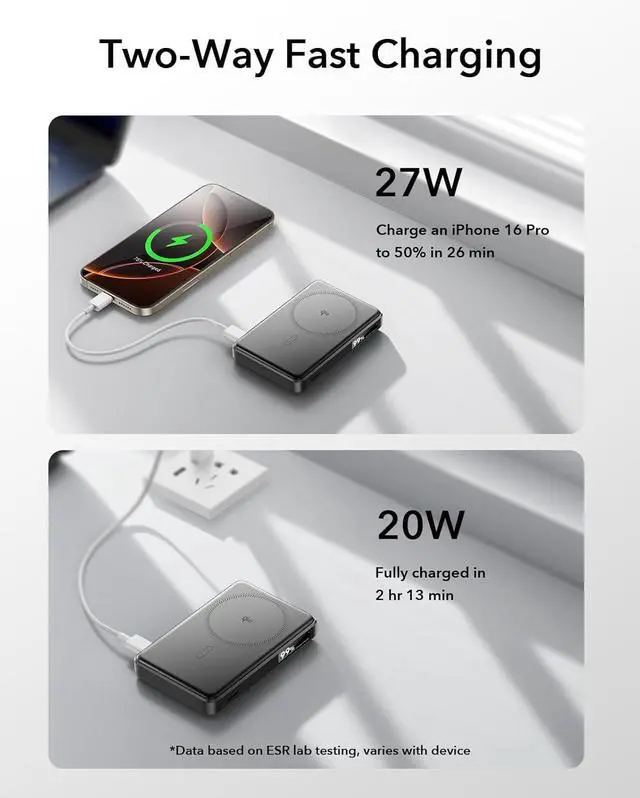 Charge 2 at Once: charge two devices simultaneously with Qi2 MagSafe wireless charging and USB-C wired charging; wireless charging is only compatible with iPhone 16/15/14/13/12 series; in the box: Qi2 portable charger, 2.0 -ft ( 0.6 m) USB-C to USB-C cable, and manual