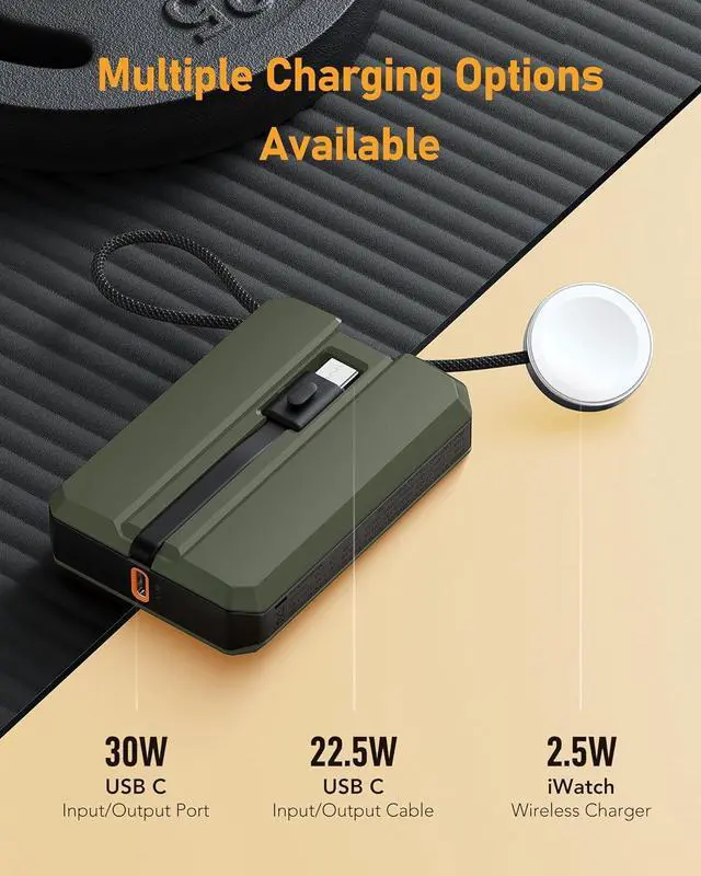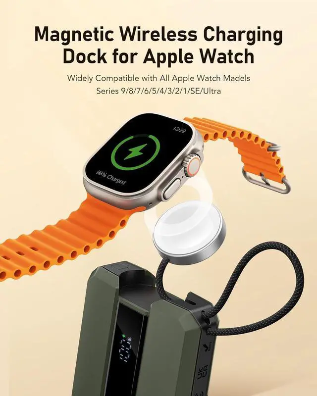 [ Sharp Design ] This compact and portable charger with a built-in USB-C cable and magnetic Apple Watch dock is ideal for travel essentials and business. In addition, the portable apple watch charger base' s cable can be used as a carrying strap. With a 10, 000mAh capacity, it ensures fast and reliable charging wherever you go.