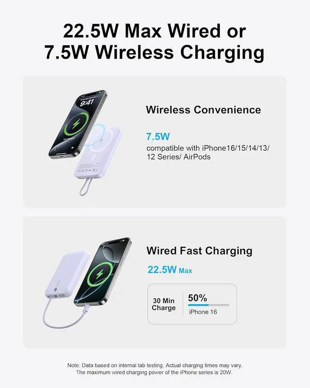 Snap: All-in-one portable phone charger combines wired and magnetic wireless charging features. For Magnetic power bank supports 5W, 7.5W and 15W wireless charging; USB-C ports support Power Delivery up to 22.5 W, allowing for fast charging of USB-C enabled devices, supporting Quick Charge 3.0 for rapid charging of legacy devices.